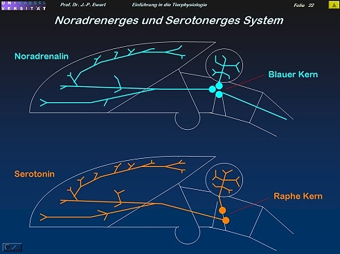 Wo liegen Neurone, die Noradrenalin bzw. Serotonin produzieren?