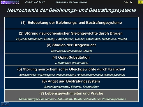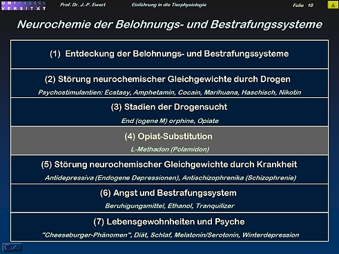 Opiat-Sucht, Methadon; Schizophrenie; Depressionen; Angst, Tranquilizer; Ethanol; "Cheeseburger-Phänomen", Melatonin/Serotonin, Winterdepression