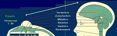 Wie leiten sich die verschiedenen Vertebraten-Gehirne vom gleichen Grundtyp (Abb.1, unten: Frosch) ab?