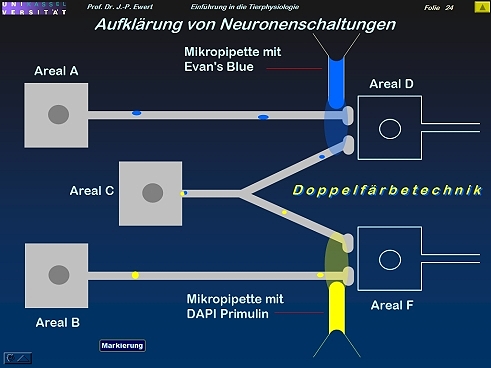 Wie lassen sich kollateral angesteuerte Zielregionen im Gehirn auffinden?Applikation zweier verschiedener Farbstoffe in zwei Areale, in denen Axone terminieren: