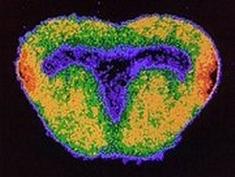 Beispiel: Stärke des Glukose-Gebrauchs im Mittelhirndach (histologischer Querschnitt) einer nach Beute wiederholt schnappenden Erdkröte gemessen mit Hilfe der 14C-2DG-Technik (Radioaktivität steigt in Richtung warmer Farben; dunkelrot/schwarz: maximal)