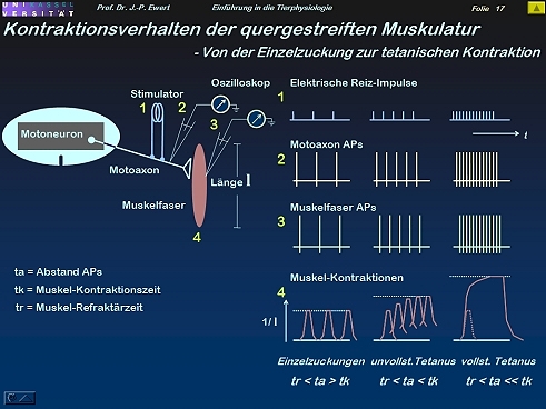 Querstreifung, Myosin/Aktin-Interaktion; IP3, Ca2+ Starter, ATP; Typ I/II-Myosine; Motorische Endplatte; Tetanus; Reflexbögen (vegetativ/somatisch)
