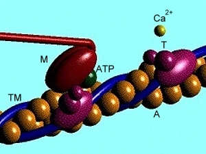 A=Aktin-Untereinheit; M=Myosin-Kopf; TM=Tropomyosin; T=Troponin; ATP=Adenosintriphosphat