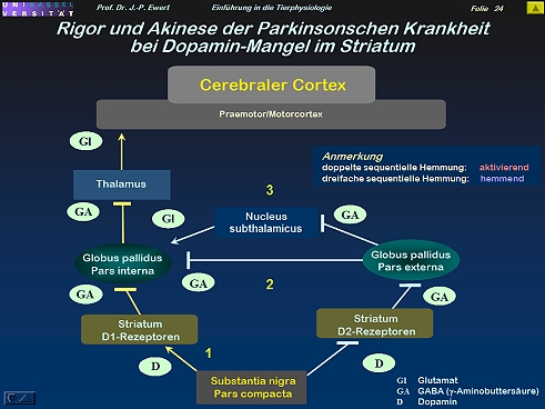 - Krankheiten des motorischen Systems: Worauf beruht Parkinsonismus (Rigor, Akinese, Tremor)?